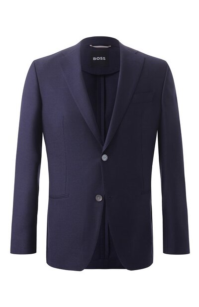 Однобортный пиджак с двумя шлицами сшит из шерсти первого пострига. Приталенная модель с широкими лацканами дополнена внутренним и тремя внешними карманами.