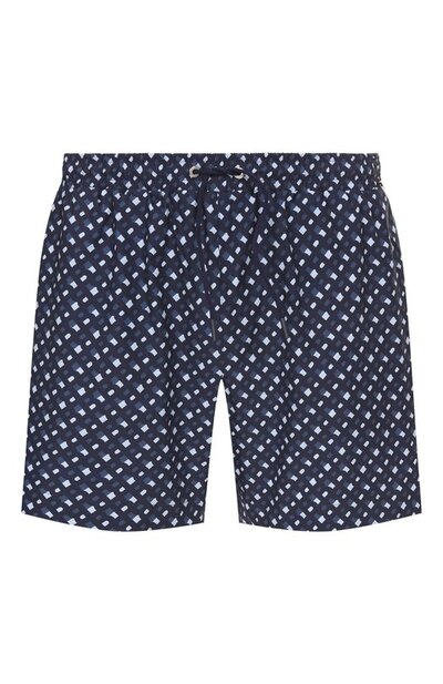 Плавки-шорты с поясом-кулиской выполнили из быстросохнущего переработанного полиэстера с фирменным паттерном. По бокам расположили открытые карманы, а сзади — на молнии. Модель с сетчатым подкладом украсили брендированной пластиной.