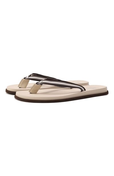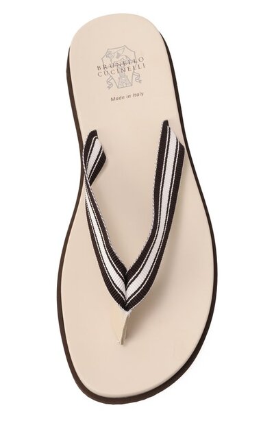 Шлепанцы с Y-образной перемычкой выполнили из лент грогрен в полоску и однотонной кожи. Подошву с формованной стелькой, украшенной логотипом и геральдической эмблемой Solomeo, изготовили из полиуретана.
