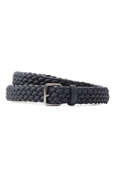 Ремень со шлевкой и квадратной пряжкой выполнили из бычьей кожи. За счет плетеной структуры в аксессуаре не нужно делать дополнительные отверстия.