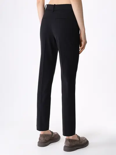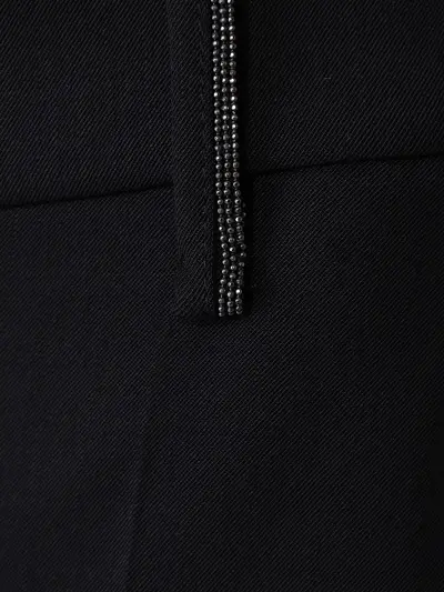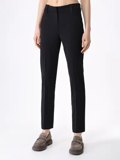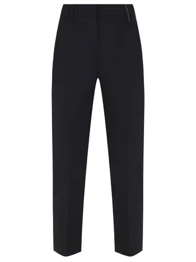 -Черные укороченные брюки из тонкой смесовой шерсти от BRUNELLO CUCINELLI. -Модель длины 7/8 с кроем по фигуре, стандартной посадкой, поясом со шлевками, прорезными карманами, застежкой на молнию, декором цепочками Мониль, графичными стрелками, которые визуально вытягивают силуэт.