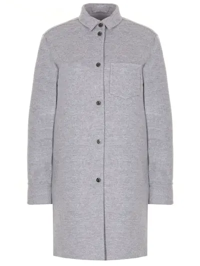 -Легкое серое пальто из смесовой шерсти от MANZONI24. -Модель свободного рубашечного кроя с длинными рукавами, манжетами, отложным воротником, нагрудным накладным карманом, застежкой на кнопки и небольшими разрезами по боковым швам.
