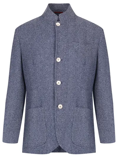 -Синее полупальто с узором "елочка" из высококачественной шерсти с добавлением шелка и кашемира от BRUNELLO CUCINELLI.