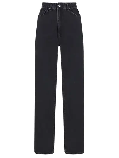 -Черные джинсы из хлопка от ALINE. -Модель прямого кроя с высокой посадкой, поясом со шлевками, прорезными и накладными карманами, застежкой на молнию и пуговицу, нашивкой с логотипом бренда сзади.