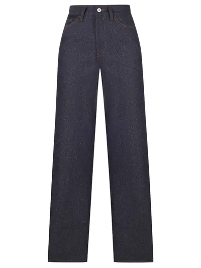 -Синие джинсы из хлопкового стрейч-денима от GOOROO. -Модель свободного кроя с легким клешем к низу изделия, высокой посадкой, поясом со шлевками, прорезными и накладными карманами, застежкой на молнию и пуговицу.