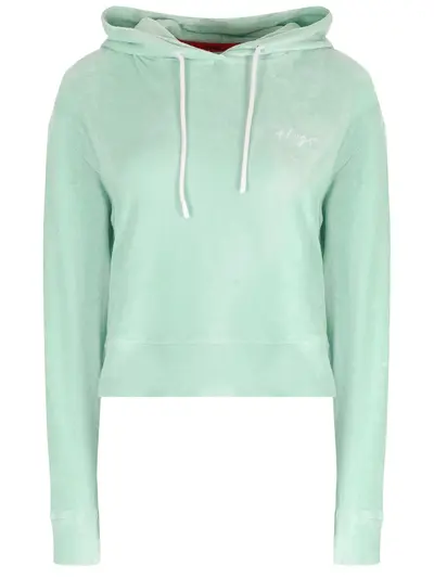 -Светло-зеленое спортивное худи из модала с махровой фактурой от HUGO. -Модель свободного силуэта со спущенной линией плеча, длинными рукавами, эластичными манжетами и поясом, капюшоном на кулиске, вышитым логотипом бренда на груди.