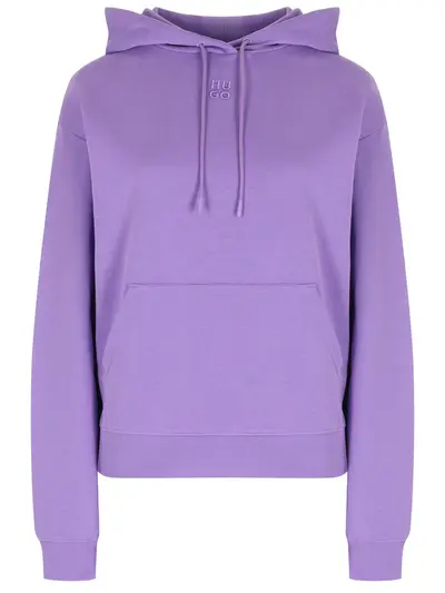 -Сиреневое спортивное худи из хлопка от HUGO. -Модель свободного силуэта со спущенной линией плеча, длинными рукавами, эластичными рельефными манжетами и поясом, капюшоном на кулиске, вышитым логотипом бренда на груди.