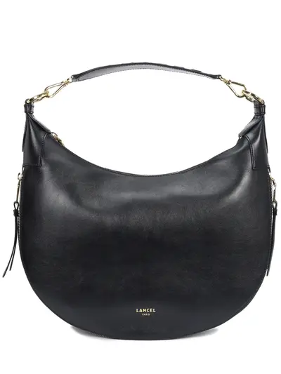 -Черная сумка-седло из натуральной кожи от LANCEL. -Модель округлой формы с короткой ручкой для носки с объемным логотипом, основной застежкой на молнию, логотипом бренда спереди, карманом внутри.
