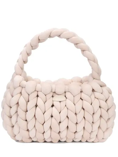 -Бежевая плетеная сумка из мягких текстильных шнуров от MC2 SAINT BARTH. -Модель мини-формата с короткой ручкой для носки, застежкой на кнопку и логотипом бренда спереди вместит в себя кардхолдер и телефон или может быть использована как косметичка.