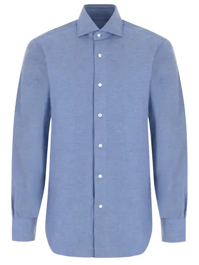 -Светло-синяя рубашка из хлопка от BARBA. -Модель стандартного кроя с длинными рукавами, манжетами, отложным воротником, застежкой на пуговицы. -Рубашка дополнит классические образы с костюмом и дерби.