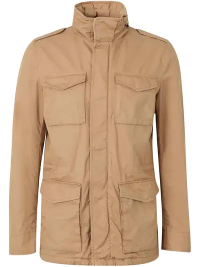 sand beige concealed front zip fastening concealed hood four front flap pockets epaulettes