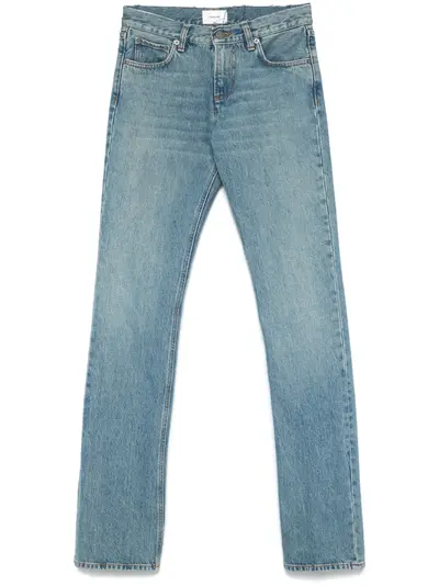 imperial blue front button and zip fastening belt loops classic five pockets logo patch to the rear