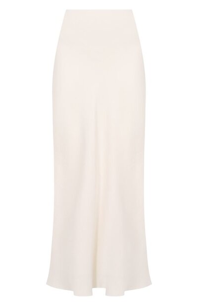 Раскроенную по косой макси-юбку с эластичным поясом сшили из вискозного твила Fluid с добавлением льна. Модель украсили высокими боковыми разрезами.