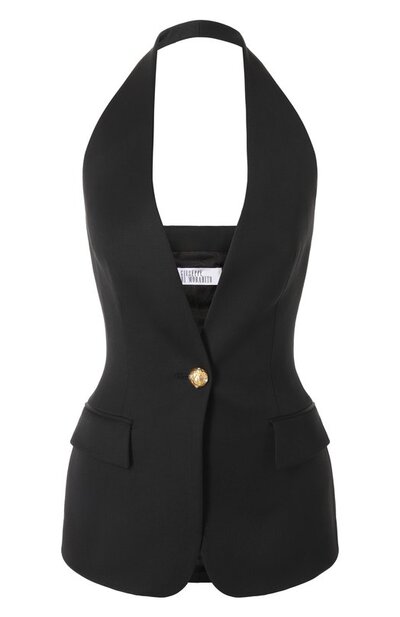Жилет с вырезом халтер и открытой спиной сшили из твила, сотканного из шерсти первого пострига. Приталенная модель, дополненная боковыми карманами с клапанами, застегивается крупной золотистой пуговицей с кристаллами.