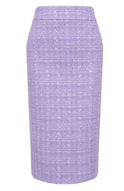 Для пошива юбки-карандаш использовали твид с добавлением шерсти и люрекса. Модель с атласным подкладом, шлицей сзади и широким поясом застегивается потайной молнией и крючком.