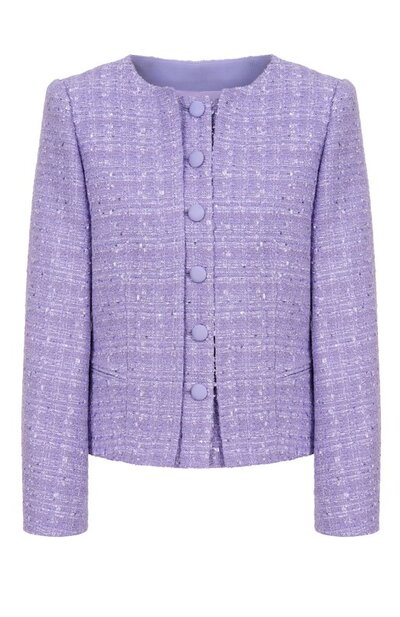Жакет с круглым вырезом сшили из смесового твида с добавлением шерсти и люрекса. Модель с пуговицами, обтянутыми корсажной тканью в тон, дополнили боковыми карманами с клапанами.