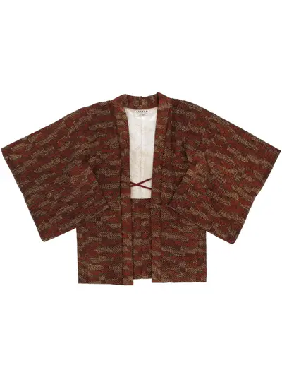 circa 1970s chocolate brown/multicolour silk all-over graphic print collarless crossover strap detail short sleeves partial lining straight hem Condition: GOOD. This previously owned and used item is in good condition with minimal signs of use. This may include fading of material or plating and scratches.