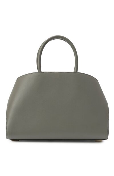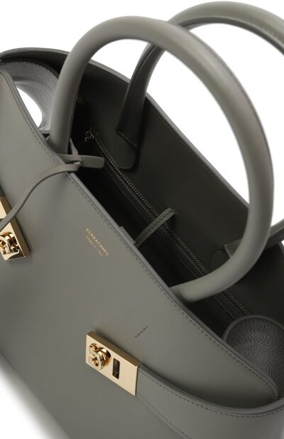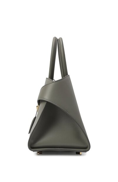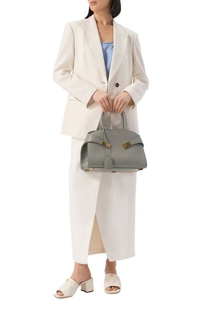 Сумка Hug с двумя ручками и съемными плечевым ремнем сшита из телячьей кожи. Асимметричная задняя панель, охватывающая аксессуар, фиксируется золотистыми пряжками Gancio. Модель с внутренним карманом на молнии дополнена брелоком.