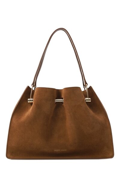 Сумка из телячьей замши дополнена двумя ручками с брендированными золотистыми фиксаторами. Внутри предусмотрены два открытых кармана и один на молнии. Аксессуар, застегивающийся кнопкой, украшен логотипом марки.