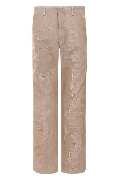 Визуально состаренные брюки D-boix 007au свободного кроя сшиты из органического хлопкового денима. Лазерная обработка материала создает микробахрому и короткие нити, которые выглядят так, будто отслаиваются от ткани.