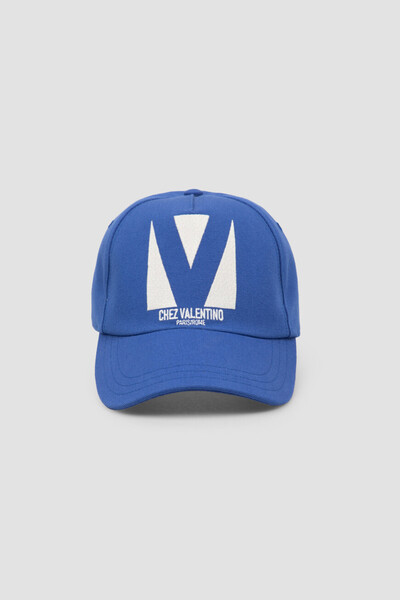 Синяя бейсболка VALENTINO на хлопковой подкладке. Отличительными особенностями изделия стали традиционная форма шестиклинки и наличие знакового декора: крупной литеры «V», вписанной в область спереди, и вышитых белых надписей «Chez Valentino» и «Paris/Rome». Спортивный аксессуар, выполненный из мягкого хлопкового трикотажа, добавит интересный акцент Вашему повседневному образу.