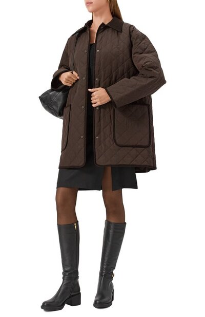 Для пошива свободной куртки оттенка Espresso использовали стеганый текстиль на основе переработанного полиэстера и органического хлопка, а для отделки выбрали вельвет. Один из двух карманов украсили логотипом бренда, вышитым в тон. Сама модель и боковые разрезы застегиваются кнопками.