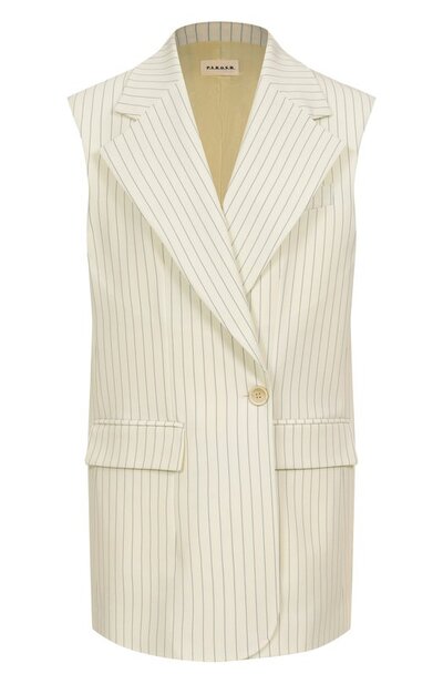 Жилет с широким лацканами, внутренним и тремя внешними карманами комфортно носить и на голое тело, и поверх водолазки. Модель в тонкую полоску сшили из костюмной ткани на основе шерсти первого пострига. Две пуговицы спереди помогут сформировать силуэт.
