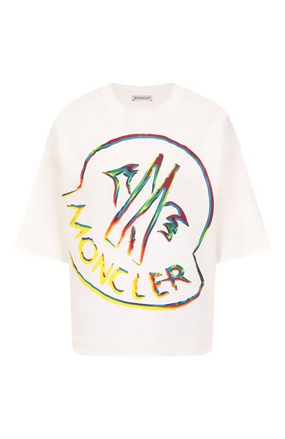 Футболку со спущенной линией плеч сшили из хлопкового джерси. Модель силуэта oversize украсили спереди принтом в виде эмблемы бренда, которую будто нарисовали от руки.
