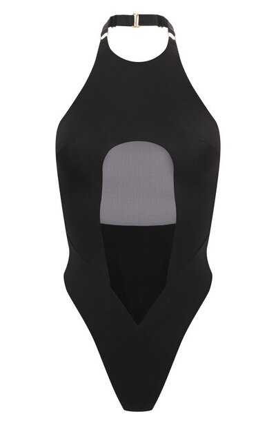 Для пошива боди Syra с регулируемой бретелью халтер использовали нейлоновое джерси с добавлением эластана. Изделие застегивается снизу перемычкой с крючком и брендированной пряжкой. Фурнитуру модели с полупрозрачной вставкой спереди покрыли 24-каратным золотом.