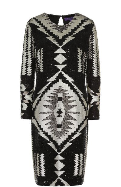 В этом черном платье легко соблюсти неписанное правило красных ковровых дорожек: сверкающие пайетки всегда смотрятся выигрышно, даже если украшают вещь простого кроя. Ральф Лорен декорировал модель этническим узором Beacon (на его создание дизайнера вдохновили узоры на одежде американских индейцев навахо). Изделие с круглым вырезом выполнено из мягкого тонкого шелка.