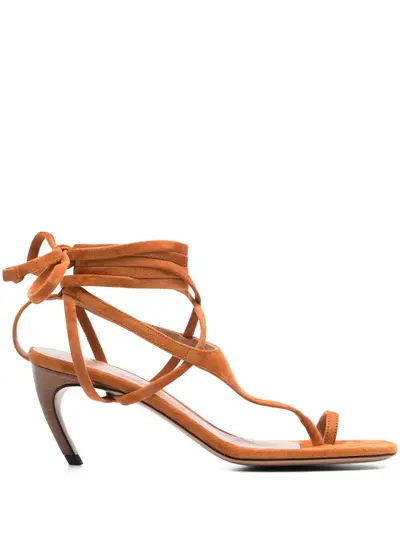 tobacco brown tie-fastening ankle strap single toe strap square open toe low sculpted heel