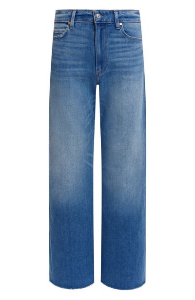 Широкие джинсы Anessa 31 с высокой посадкой сшиты из фирменного эластичного денима PAIGE VINTAGE. Модель с необработанными краями дополнена пятью карманами, а пояс украшен брендированным патчем сзади.