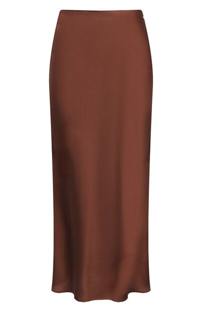 Миди-юбка сшита из струящегося атласа на основе переработанного полиэстера. Модель с миниатюрной брендированной подвеской застегивается потайной молнией сбоку.