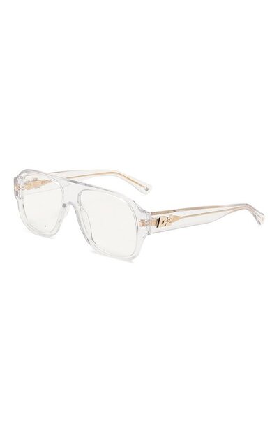 Прозрачный ацетат помогает этой оправе с четкой линией верха оставаться почти незаметной образе. Сквозь дужки просвечивает узкий металлический каркас, с которым гармонирует золотистая монограмма D2 рядом с петлями. На заушниках – миниатюрное изображение кленового листа.