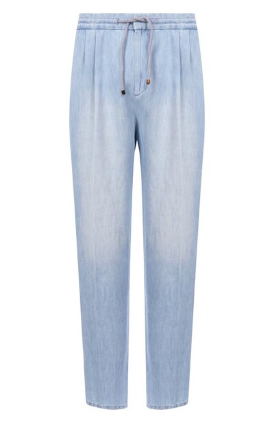 Брюки с эластичным поясом-кулиской и двойными защипами дополнили боковыми и задними прорезными карманами. Выбеленную модель сшили из хлопковой ткани с добавлением льна.