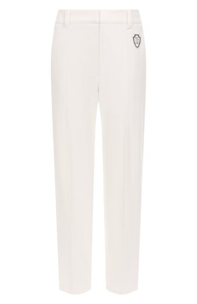Брюки с высокой посадкой и стрелками дополнили четырьмя карманами. Модель из эластичного хлопкового твила украсили сбоку геральдическим патчем с вышитой люрексом эмблемой Solomeo.