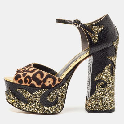 A mix of textures and colors makes these Marc Jacobs platform sandals anything but ordinary. Calf hair, python embossing and glitter bring a wild, fun energy.