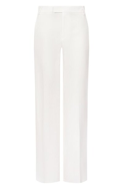 Свободные брюки сшили из вискозного габардина, укрепленного полиамидом. Над одним из четырех карманов расположили фирменную пластину. Модель застегивается потайными молнией и крючком.