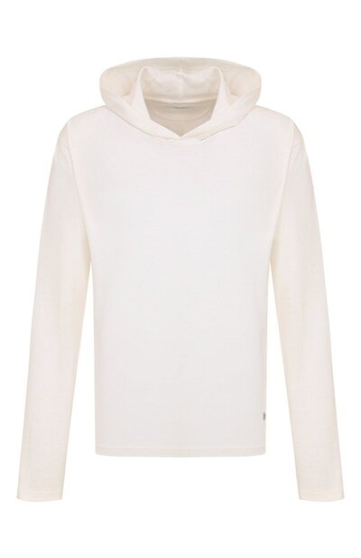 Лонгслив с капюшоном и слегка спущенной линией плеч сшили из хлопкового трикотажа с добавлением шелка. Модель украсили фирменным октагоном с монограммой SR и ярлыком с итальянским триколором в боковом шве.