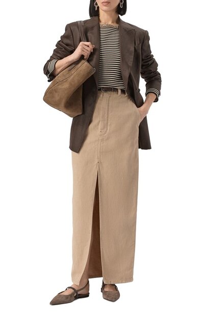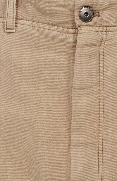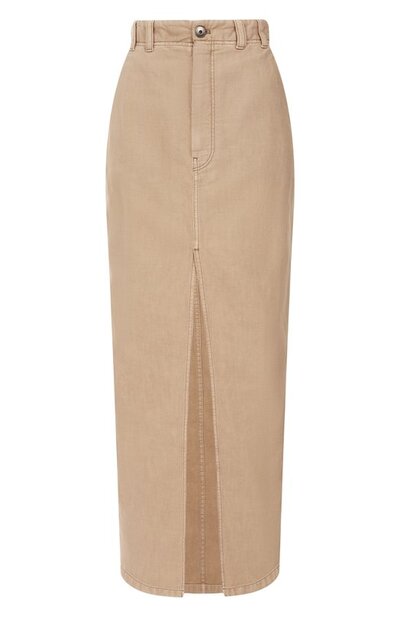 Юбку Chino с высоким разрезом спереди сшили из хлопкового твила Cover с добавлением льна. Окрашенную в готовом виде модель с боковыми и задними карманами украсили брендированным патчем на поясе и цепочкой мониль на шлевке сзади.