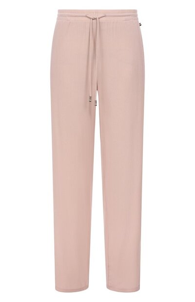 Брюки свободного кроя сшиты из модала в рубчик. Эластичная модель с двумя врезными карманами дополнена широким поясом-кулиской с фирменными эглетами и миниатюрным ярлыком-триколором.