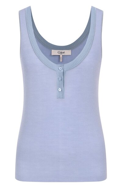 Майку из шерстяного трикотажа в рубчик дополнили более темным кантом на вырезе и планкой с пуговицами. Принадлежность модели бренду обозначили золотистой монограммой CC на спинке.