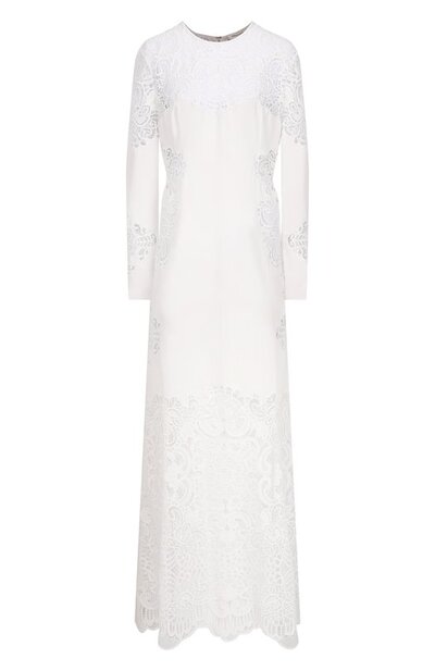 Макси-платье с расклешенным подолом выполнили из кади и кружева макраме с графичным цветочным узором. Модель застегивается пуговицами в тон и потайной молнией сзади.