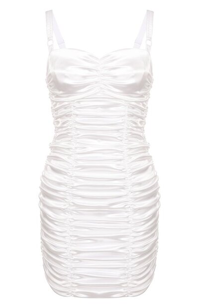 На мини-платье из атласа стрейч сформировали мягкую драпировку. Внутри предусмотрели плотные чашечки на косточках, а швы усилили. Модель с регулируемыми эластичными бретелями застегивается молнией и крючком на спинке.