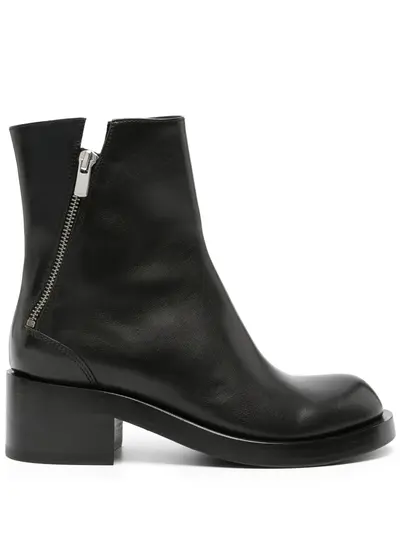 black buffalo leather smooth grain round toe side zip fastening branded leather insole 55mm low block heel rubber outsole ankle-length