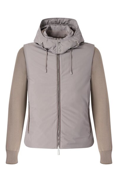 Куртку Evan-STP со съемным капюшоном, сшитую из гладкой полиэстеровой ткани с водоотталкивающей мембраной, можно превратить в жилет, отстегнув трикотажные рукава. Встречную молнию и боковые карманы обвели бархатным кантом, а два внутренних — атласным. В изделии, утепленном гусиным пухом, будет комфортно при температуре от 5 до 16 градусов.
