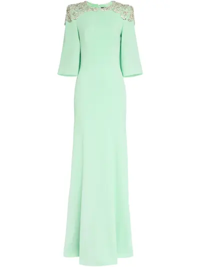 mint green concealed rear zip fastening gemstone detailing round neck bell sleeves
