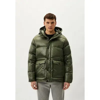 Пуховик выполнен из водоотталкивающего стеганого текстильного материала. Модель прямого кроя. Особенности: несъемный капюшон, воротник-стойка, застежка-молния с ветрозащитным клапаном на кнопках, 4 внешних кармана и 1 внутренний, кулиса по низу изделия, гладкая текстильная подкладка.