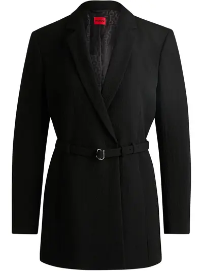 black concealed front fastening two side slit pockets notched lapels belted waist