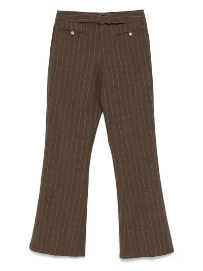 circa 2000s chocolate brown wool blend pinstripe pattern concealed fly and button fastening front buckle fastening two side button-fastening pockets pressed crease full-length Condition: GOOD. This previously owned and used item is in good condition with minimal signs of use. This may include fading of material or plating and scratches.